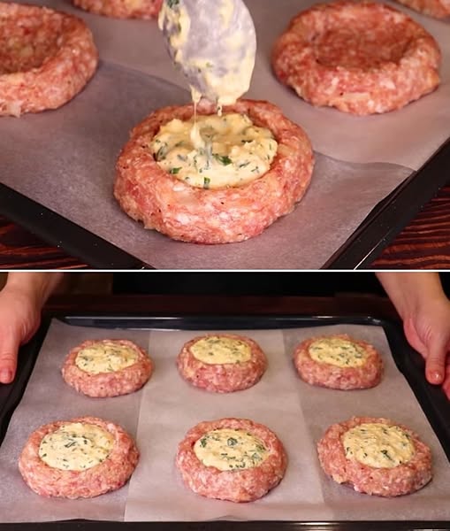1️⃣ Valmista lihaseos – yhdistä kulhossa liha, sipuli, valkosipuli, muna, korppujauhot ja mausteet. Vaivaa huolellisesti käsin. 2️⃣ Muotoile lihapullat – jaa seos kuuteen yhtä suureen osaan, pyörittele niistä palloja, litistä ne ja tee keskelle kuoppa.